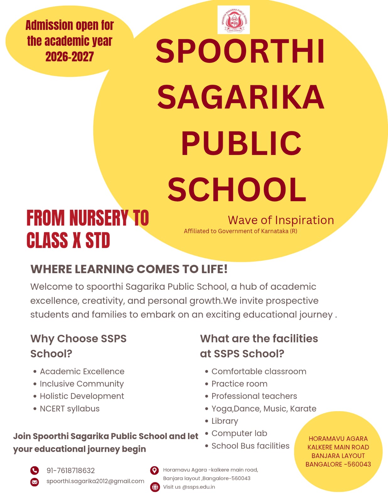 Spoorthi Sagarika Public School is a reputed co-educational institution established in 2012, committed to providing quality education rooted in academic excellence and holistic development. Recognized by the Affiliated to government of karnataka (R), the school follows a structured, student-centric curriculum designed to nurture young minds and prepare them for a dynamic future.